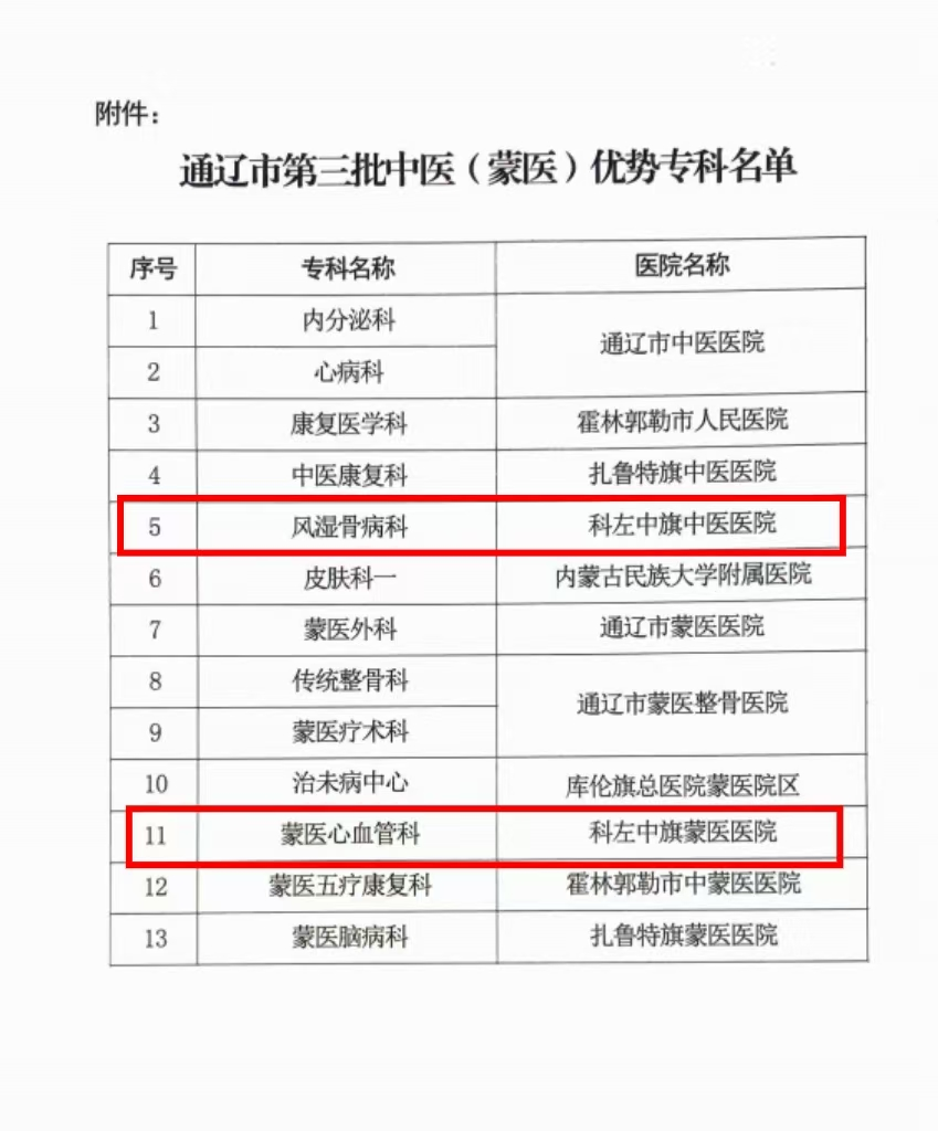 喜报:科左中旗中医医院“风湿骨病科”、科左中旗蒙医院“蒙医心血管科”获评通辽市级中医(蒙医)优势专科