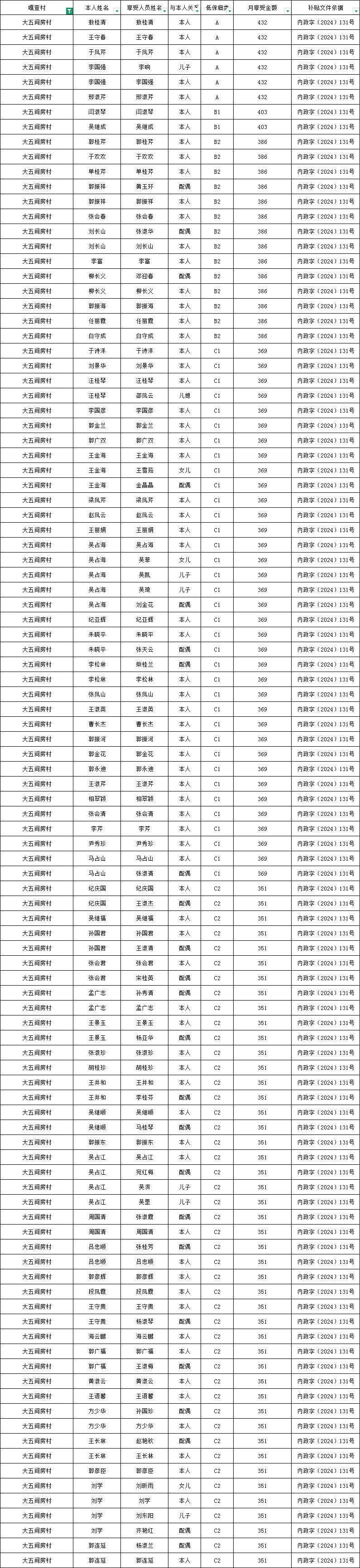 五间房村2026年4月农村低保资金发放花名册